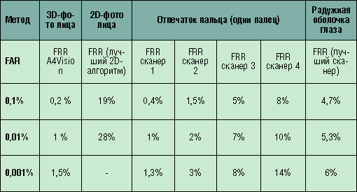 Источник: НПО "Информация" Данные, приведенные в таблице свидетельствуют что сравнимой точностью обладают три метода биометрической идентификации, а именно: по отпечатку пальца, по трехмерному изображению лица и по радужной оболочке глаза. Распознавание по двумерному изображению лица уступает перечисленным методам по точности на порядок, но наиболее удобно для визуального сравнения оператором фотографии в паспорте с личностью его владельца. При базах данных на 1000—2000 человек методы идентификации по радужной оболочке, пальцу, 3D-фото могут обеспечить приемлемую точность распознавания. Но при базах данных более 2000 человек ни один из биометрических методов “в чистом виде” не применим для большинства задач. В этом случае необходимо использовать несколько биометрических методов одновременно. Например, комбинированный метод с использованием технологий распознавания по 3D- и 2D-фотографиям обеспечивает достаточную точность в режиме идентификации при базах данных размером до 10 000 лиц, а в перспективе — до 100 000 человек. Тем не менее, даже эти показатели неприемлемы для задач государственного или межгосударственного масштаба, где требуется идентификация по базам данных в несколько сотен тысяч или несколько миллионов человек. Такой задачей может быть, скажем, задача поиска человека с заданными биометрическими характеристиками в государственной базе данных выданных паспортов или виз. В этом случае возможны комбинированные системы “много пальцев”, или “палец + лицо”, или “палец + радужная оболочка глаза” и т. д. Наталья Рудычева / CNews |