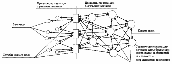 Процесс создания режима «одного окна» можно условно разделить на две взаимосвязанные части, отрабатываемые параллельно. Первой из них является все, что касается заявителя (запрос, подтверждение прав на получение испрашиваемого пакета документов, оплата, в случае подготовки документов на возмездной основе, получение испрашиваемого пакета документов и т.п. — front-office), второй то, что происходит без участия заявителя (подготовка пакета документов, получение необходимой информации и согласований, взаиморасчеты и т.п. — back office).