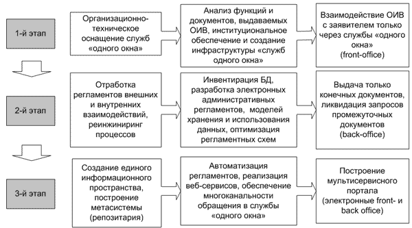 Специалисты служб «одного окна» начинают принимать документы от заявителей по методу индукции (от простых к сложным). На этом этапе обеспечивается выдача большинства исходящих документов органов исполнительной власти через «одно окно», хотя еще нельзя сказать, что органы исполнительной власти окончательно перешли на режим «одного окна», т.к. для того чтобы получить необходимый документ, заявитель вынужден обойти целый ряд «окон», собрать необходимое количество промежуточных документов и уже только после этого обратиться в то «одно окно», которое выдаст ему конечный документ. Этапы реализации режима «одного окна» (рис. 2)