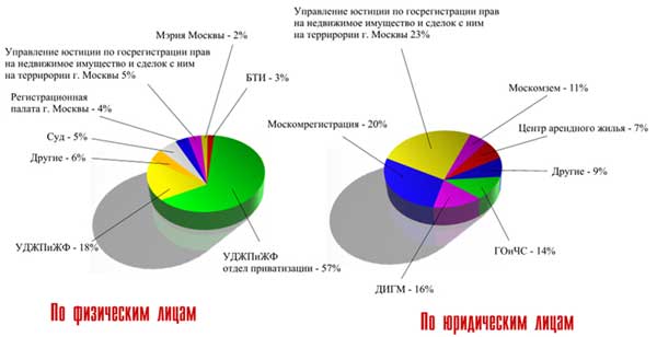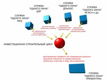 Так, например, в Зеленограде оказалось, что в настоящий момент отсутствует предмет напряженного внешнего взаимодействия, несмотря на то, что формально префектура принимает конечный документ по многим вопросам. Напр., по инвестиционным объектам, проект распоряжения префекта готовит Территориальное отделение регулирования землепользования Москомзема, а для его подготовки в свою очередь требуется множество заключений от служб «одного окна» других организаций (Инспекция государственного строительного надзора, Москомархитеатура, Департамент природопользования и охраны окружающей среды, Роспотребнадзор и др.). Таким образом, для оформления Оформления земельно-имущественных прав через обращения в службы «одного окна» (рис.3)