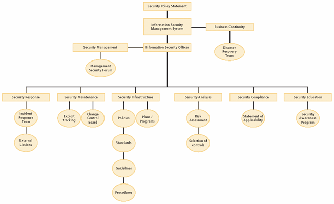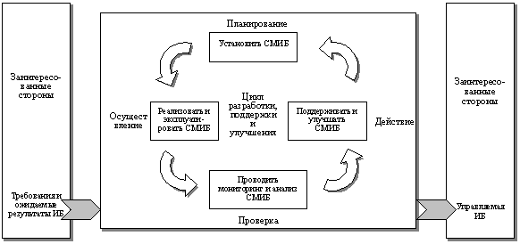 Процесс непрерывного совершенствования обычно требует первоначального инвестирования: документирование деятельности, формализация подхода к управлению рисками, определение методов анализа и выделение ресурсов. Эти меры используются для приведения цикла в действие. Они не обязательно должны быть завершены, прежде чем будут активизированы стадии пересмотра. На стадии планирования обеспечивается правильное задание контекста и масштаба СУИБ, оцениваются рисков информационной безопасности, предлагается соответствующий план обработки этих рисков. В свою очередь, на стадии реализации внедряются принятые решения, которые были определены на стадии планирования. На стадиях проверки и действия усиливают, исправляют и совершенствуют решения по безопасности, которые уже были определены и реализованы. Проверки могут проводиться в любое время и с любой периодичностью в зависимости от конкретной ситуации. В некоторых системах они должны быть встроены в автоматизированные процессы с целью обеспечения немедленного выполнения и реагирования. Для других процессов реагирование требуется только в случае инцидентов безопасности, когда в защищаемые информационные ресурсы были внесены изменения или дополнения, а также когда произошли изменения угроз и уязвимостей. Необходимы ежегодные или другой периодичности проверки или аудиты, чтобы гарантировать, что система управления в целом достигает своих целей. Один из вариантов организационной структуры СУИБ