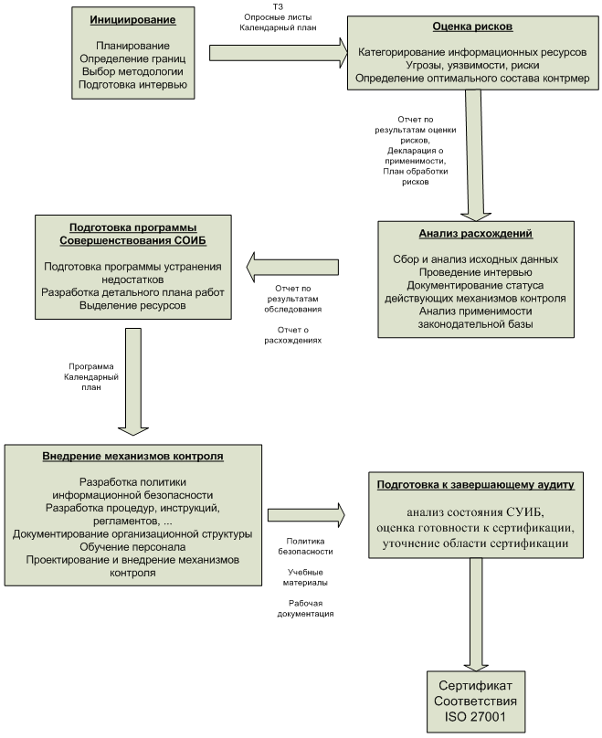 На первом этапе проводится предварительный аудит СУИБ, в ходе которого оценивается текущее состояние, осуществляется инвентаризация и документирование всех основных составляющих СУИБ, определяются область и границы сертификации и выполняется еще целый ряд необходимых подготовительных действий. По результатам аудита разрабатывается детальный план мероприятий по подготовке к сертификации. На втором этапе выполняется оценка информационных рисков, основной целью которой является определение применимости описанных в стандарте механизмов контроля в данной конкретной организации, подготовка декларации о применимости и плана обработки рисков. На третьем этапе выполняется анализ расхождений с требованиями стандарта, в результате которого оценивается текущее состояние механизмов контроля в организации и идентифицируются расхождения с декларацией о применимости. На последующих этапах осуществляется планирование и внедрение недостающих механизмов контроля, по каждому из которых разрабатывается стратегия и план внедрения. Работы по внедрению механизмов контроля включают в себя три основные составляющие: подготовка сотрудников организации: обучение, тренинги, повышение осведомленности; подготовка документации СУИБ: политики, стандарты, процедуры, регламенты, инструкции, планы; подготовка свидетельств функционирования СУИБ: отчеты, протоколы, приказы, записи, журналы событий и т.п. На заключительном этапе осуществляется подготовка к сертификационному аудиту: анализируется состояние СУИБ, оценивается степень ее готовности к сертификации, уточняется область и границы сертификации, проводятся соответствующие переговоры с аудиторами органа по сертификации. Подробные рекомендации по созданию СУИБ и подготовки к сертификации содержатся в серии руководящих документов BSI BIP Точки преткновения В процессе внедрения СУИБ возникает много точек преткновения. Часть из них связаны с нарушением описанных выше фундаментальных принципов управления безопасностью. Серьезные затруднения для российских организаций лежат в законодательной области. Неполнота и противоречивость действующего российского законодательства, его запретительный характер в области использования криптографии и во многих других областях, а также неотрегулированность системы сертификации средств защиты информации серьезно затрудняет выполнение одного из главных требований стандарта — соответствие действующему законодательству. Источником затруднений нередко служит неправильное определение области действия и границ СУИБ. Слишком широкая трактовка области действия СУИБ, например, включение в эту область всех Столь же важно правильно представлять, где проходят границы СУИБ и каким образом она связана с другими системами управления и процессами организации. Например, система управления ИБ и система управления непрерывностью бизнеса (ВСМ) организации тесно пересекаются. Последняя является одной из 11 определяемых стандартом областей контроля информационной безопасности. Однако СУИБ включает в себя только ту часть BCM, которая связана с ИБ — это защита критичных бизнес процессов организации от крупных сбоев и аварий информационных систем. Другие аспекты BCM выходят за рамки СУИБ. Стандарт — гарантия безопасности Сегодня организация раб