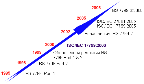 Прародитель международных стандартов управления информационной безопасностью — британский BS 7799 — уже давно вышел за национальные рамки. Первая его часть, BS Существует множество областей управления: производство, финансы, продажи, закупки, персонал и т.д. Благодаря развитию современного высокотехнологичного бизнеса постепенно осознается важность и таких областей, как информационные технологии, информационная безопасность, качество и окружающая среда. Об этом говорит растущая популярность во всем мире соответствующих международных стандартов серии ISO 2700х, ISO 2000х, ISO 900х и ISO 1400х. Основные принципы управления, по большому счету, для всех областей одинаковы, поэтому соответствующие системы управления дополняют одна другую, образуя интегрированную систему управления организации (IMS). Сложно переоценить вклад Британского института стандартов (BSI) в разработку международных стандартов управления организацией, в том числе и интегрированных систем управления, которым посвящена серия публикаций BSIBIP 2000. Вслед за повсеместным распространением ISO 9001 и систем управления качеством, в России Прародитель международных стандартов управления информационной безопасностью — британский стандарт BS 7799. Первая его часть — BS Вторая часть BS 7799 пересматривалась в 2002 г., а в конце 2005 г. была принята ISO в качестве международного стандарта ISO/IEC 27001:2005 «Информационные технологии — Методы обеспечения безопасности — Системы управления информационной безопасностью — Требования». В это же время была обновлена и первая часть стандарта. С выходом ISO 27001 спецификации СУИБ приобрели международный статус, и теперь следует ожидать значительного повышения роли и престижности СУИБ, сертифицированных по стандарту ISO 27001. Семейство международных стандартов управления безопасностью 2700х продолжает активно развиваться. В соответствии с планами ISO оно будет включать стандарты, определяющие требования к СУИБ, систему управления рисками, метрики и измерения эффективности механизмов контроля, а также руководство по внедрению. Для этого семейства стандартов будет использоваться последовательная схема нумерации, начиная с 27000 и далее. ISO/IEC 17799:2005 в последующем будет переименован в ISO/IEC 27002. В разработке находится также проект стандарта ISO/IEC 27000, который будет содержать основные принципы и определения и будет унифицирован с популярными стандартами управления ИТ: COBIT и ITIL. В начале 2006 г. был принят новый британский национальный стандарт в области управления рисками информационной безопасности BS История стандарта BS 7799