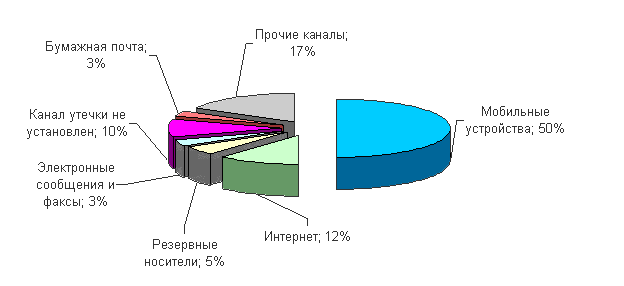 Наибольшее количество утечек (50 %) произошло через мобильные устройства (ноутбуки, КПК, USB-флэшки, CD и DVD-диски и др.). Компактность мобильных устройств, помимо всех очевидных преимуществ, имеет и менее заметный недостаток в отношении защиты информации. Будь то ноутбук, КПК или флэш-карта, это устройство очень легко потерять или спрятать. Вследствие непреднамеренной потери носителя конфиденциальные данные попадают к неизвестным людям, которые распоряжаются ими по своему усмотрению. В то же время внутренние нарушители легко спрячут маленький носитель и вынесут данные с рабочего места.