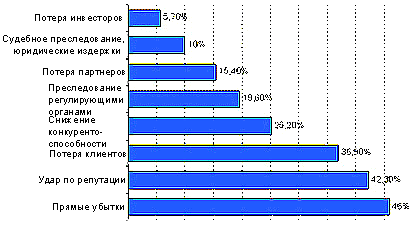 Обратимся теперь к исследованию «Внутренние ИТ-угрозы в России 2006», в ходе которого было опрошено 1450 российских организаций. У нас, как и за рубежом, в числе наиболее плачевных последствий утечки фигурируют удар по репутации и потеря клиентов (79,2 %), прямые финансовые убытки (46 %), падение конкурентоспособности (25,2 %). При этом юридические издержки составляют лишь 10 %. Другими словами, российские организации действительно не боятся судебного преследования и наказания со стороны правоохранительных или надзорных органов. В то же самое время руководители отдают себе отчет в том, что если об утечке станет известно публике, то избежать потери репутации вряд ли удастся. Это в свою очередь прямиком приводит к потере существующих клиентов и трудностям в привлечении новых клиентов.