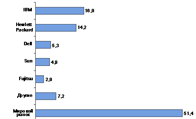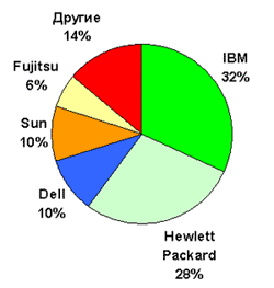 Источник: IDC, 2006 Суммарный оборот рынка серверов составил в 2005 году 51,4 млрд.долл. "Первой скрипкой" остается IBM с рыночной долей более 32 % и оборотом в 16,9 млрд.долл. О своих претензиях на вершину пьедестала все настойчивее заявляет HP (28 %), с годовым оборотом 14,2 млрд.долл. Замыкает призовую тройку Dell, с показателем около 10 %. Далее следуют Sun с оборотом 4,9 млрд.долл. (10 %) и Fujitsu — с 2,9 млрд.долл. (6 %). |