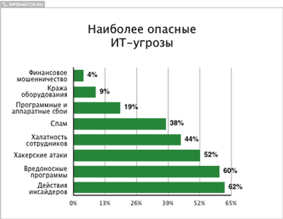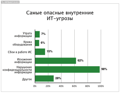 Исследование компании InfoWatch, охватившее около 400 российских организаций, позволило установить, что руководство в большинстве своем осознает масштаб проблемы. Более половины (62%) респондентов считают, что именно действия инсайдеров являются самой опасной угрозой ИТ-безопасности, а подавляющее большинство (98%) согласилось, что нарушение конфиденциальности информации — самая большая внутренняя угроза.