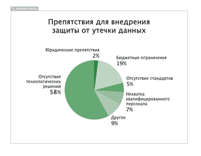 Объяснение на удивление низкого уровня использования технических средств и организационных мер состоит преимущественно в том, что на рынке отсутствуют специализированные технологические решения. Эту причину указало более половины (58%) опрошенных компаний. Что же до бюджетных ограничений, являющихся наиболее распространенным препятствием на пути внедрения информационных технологий в целом, то эта причина набрала лишь 19% голосов опрошенных. В то же время остальные трудности (нехватка персонала, юридические препятствия, отсутствие стандартов) присутствовали в результатах опроса эпизодически. Таким образом, российский бизнес полностью уверен в отсутствии технологических решений для защиты от внутренних угроз в общей сложности и утечки секретных данных, в частности.