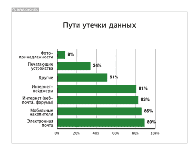 Выше уже отмечалось, что чувствительная информация может быть вынесена за пределы компании десятком различных способов, однако, как показало исследование компании InfoWatch, наибольшей популярностью пользуются следующие коммуникационные каналы: электронная почта (89%), мобильные накопители (86%), интернет и веб-почта (83%), а также сетевые пейджеры (81%). Таким образом, именно на эти средства связи следует обращать внимание в первую очередь.