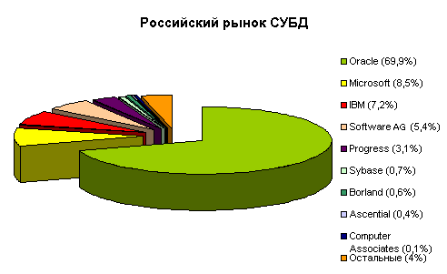 Источник: IDC, 2004 Можно предположить, что подобная позиция IBM на российском рынке СУБД объясняется Продукция Microsoft (в первую очередь, Windows, а за ней и MS SQL Server) попала на компьютеры российских пользователей сначала тоже нелегально. Однако в итоге это обеспечило корпорации второе место по продажам СУБД. Вот и борись после этого с компьютерным пиратством. Иностранцы предлагают Oracle предлагает решения в первую очередь для таких отраслей, как авиация и ВПК, автомобилестроение, металлургия, нефтегаз, химическая и пищевая промышленность, транспорт и грузоперевозки, телекоммуникации, финансовые институты и госсектор. СУБД Oracle используют, в частности, «Газпром», Минатом России, АВПК "Cухой", "Штерн Цемент", "Связьинвест", Банк России, Банк Москвы, группа "ИФД КапиталЪ", Сургутнефтегазбанк, ФНС России, ФТС России и др. Microsoft позиционирует свою СУБД, как основу для построения корпоративных хранилищ данных, электронной коммерции и IBM предлагает решения для нефтеперерабатывающей промышленности, энергетического сектора, для банков и финансовых организаций, а также решения в сфере обучения, решения для государственных организаций ( Adabas позиционирует свою СУБД, как наиболее эффективную с точки зрения приведенных затрат при обработке онлайновых деловых транзакций. Среди решений, использующих эту СУБД, «Автоматизированная система сбора, передачи, обработки и отображения технологической информации (АССПООТИ) "Газпром"», разработанная подразделением “ИнформГаз”, «Айтекс-Предприятие» (базовый продукт для создания интегрированной системы управления предприятием Progress Software позиционирует свою СУБД как встраиваемую с минимальной стоимостью владения, обеспечивая разработчикам полный набор инструментария, входящий в платформу Progress OpenEdge. Решения на базе Progress RDBMS предлагают, в частности, IBS (система автоматизированного управления торговой организацией «IBS TRADE», комплексная система автоматизированного управления торговым домом «IBS TRADE HOUSE», система автоматизации автозаправочных комплексов «IBS GAS»), «Никос-Софт» (система учета на крупном предприятии «NS2000»), Фронтстеп СНГ (интегрированная система автоматизации всех участков деятельности промышленного предприятия «SyteLine»), РИККО (корпоративный депозитарный комплекс для фондового рынка «DepoNet Pro», система ведения реестров «DepoNet-Реестр», система внутреннего учета сделок с ценными бумагами «DepoNet бэк-офис»). Эти решения внедрены на таких предприятиях, как: В целом можно резюмировать, что решения от Oracle и IBM используются в России (как и во всём мире) в первую очередь для комплексной автоматизации крупных предприятий, обеспечивая ядро управления ресурсами компаний в критических для бизнеса областях в условиях хранения и обработки сверхбольших объёмов данных, зачастую хранимых на разных программно-аппаратных платформах. СУБД от Oracle и IBM обладают высокими показателями быстродействия, готовности и масштабируемости, поддерживают все существующие платформы, легко интегрируются как с собственными средствами разработки, так и с платформой .NET, поддерживают работу с собственными средствами ERP, CRM и BI, а также полностью совместимы с решениями SAP R/3, MySAP. СУБД Oracle и IBM обладают высокой надёжностью и производительностью, при очень высокой стоимости. СУБД Microsoft SQL Server лидирует на платформе Wintel в области построения ERP и Р