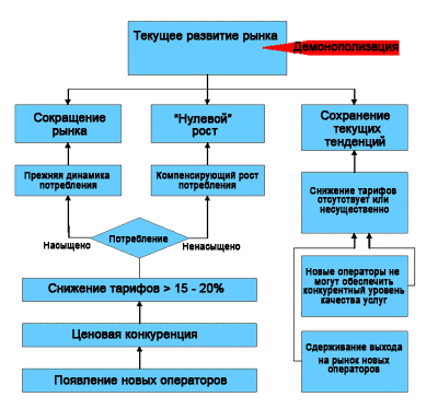 Если потребление насыщено, т.е. уже сегодня тарифы позволяют людям говорить столько, сколько им нужно, а имеющийся рост определяется в основном усложнением рынка — появлением новых постоянных абонентов или новых связей (например, новых деловых контактов) у старых абонентов — то удешевление услуг само по себе не приведет к дополнительному росту потребления. Более того, если сегодняшние темпы роста потребления услуг связи будут перекрываться темпами удешевления тарифов, то возникнет сокращение рынка. Последнее вполне реально — заявленные тарифы МТТ ниже тарифов "Ростелекома" в среднем на 10-15%, а рост потребления услуг дальней связи за 2005 год составил менее 2%. Таким образом, возможность сокращения рынка вполне очевидна.