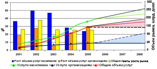 Если бы 100%-ный уровень телефонизации населения был достигнут сегодня, то верхний физический предел этого сегмента рынка составил бы около 100 млрд.руб., а дальнейший рост рынка ограничивался бы только ростом тарифов. При этом нижняя граница роста определяется чисто инфляционным ростом текущего объема рынка. Таким образом, можно очертить полосу, в рамках которой возможны вариации развития. Как уже отмечалось выше, скорость развития в пределах этой полосы определяется темпами физического роста рынка, которые в свою очередь зависят, во-первых, от спроса на подключения и, во-вторых, от технологической способности компаний местной проводной связи удовлетворить этот спрос.