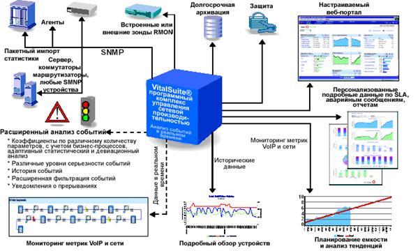 Комплекс управления сетевой производительностью VitalSuite — это полнофункциональный автоматизированный инструмент, предоставляющий данные о производительности сети, необходимые для предотвращения проблем, оптимизации ресурсов и планирования операций с учетом максимизации ROI. Система имеет веб-интерфейс для сквозного обзора географически распределенной гетерогенной инфраструктуры, который позволяет ИТ-администраторам осуществлять централизованный мониторинг, анализ, управление и прогнозирование сетевой производительности.