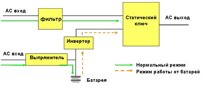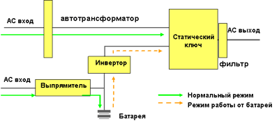 Резервный ИБП подключается параллельно сети электропитания. В нормальном режиме питание на нагрузку подаётся непосредственно от сети и одновременно происходит подзарядка батарей.